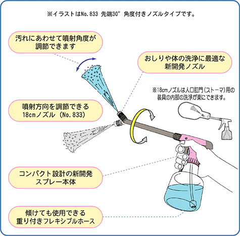 ●1ストロークで約2mL の液が噴射できるので おしりや体の洗浄に最適です。